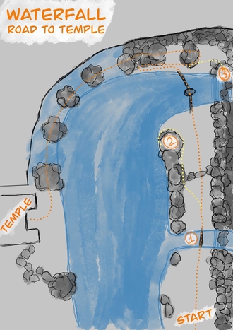 The design blends a mostly linear progression with subtle side routes that reward curious players with a breathtaking vista point and a concealed treasure cache. Core mechanics—running and a simple controlled jump—are tuned to keep the pace brisk yet exploratory. Rich ambient audio (rushing water, birdsong, leaf rustle) and a vibrant palette of greens, blues, and moss-covered stone set a mysterious, adventurous mood. The level concludes as you finally breach the waterfall’s mist and arrive at the ancient temple entrance—an evocative teaser for the larger journey to come.